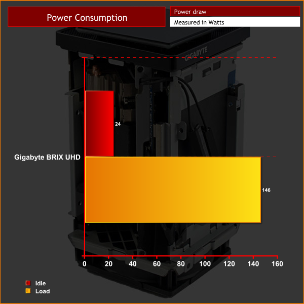 The BRIX UHD draws very little power at idle, and even under load the power draw is still significantly less than what a full-sized gaming desktop would be pulling from the wall. Considering the good gaming experience at 1080p, this is another impressive result.