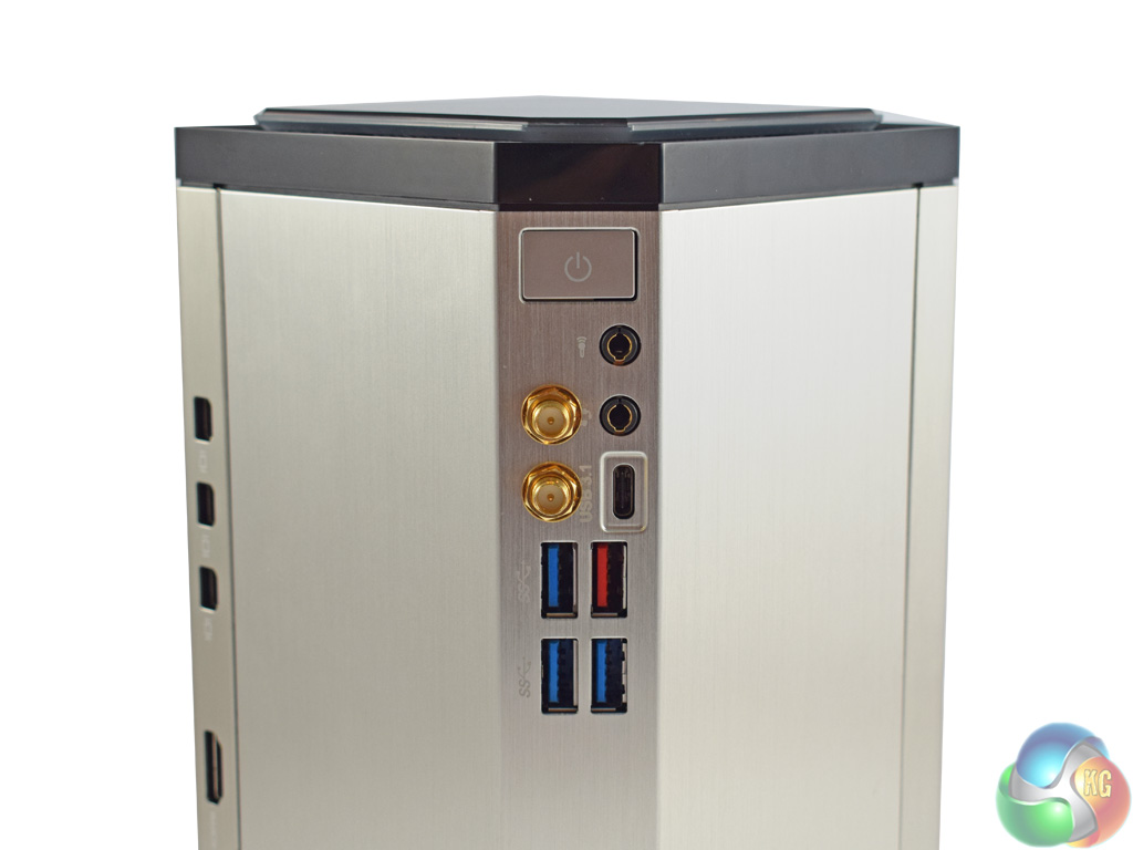 In the rear corner are the other I/O ports. A good array for such a small device, we find 2x USB 3.1 (one Type-C, one Type-A) as well as 3x USB 3.0. There are also the usual headphone jacks and antenna mounts for the integrated WiFi chip.