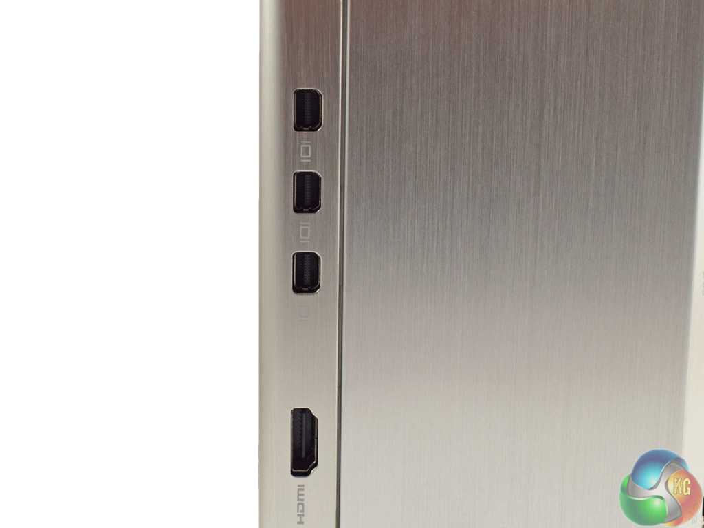 The video-out connectors are on the side, with 3x mini DisplayPorts, and just the 1x HDMI 2.0 (4K60 capable).