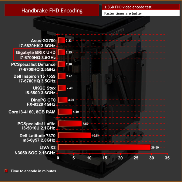 Here, we see more similarity between the mobile i7 CPUs. The BRIX UHD is just 3 seconds faster than PCSpecialist's Defiance III – the slenderest of leads.