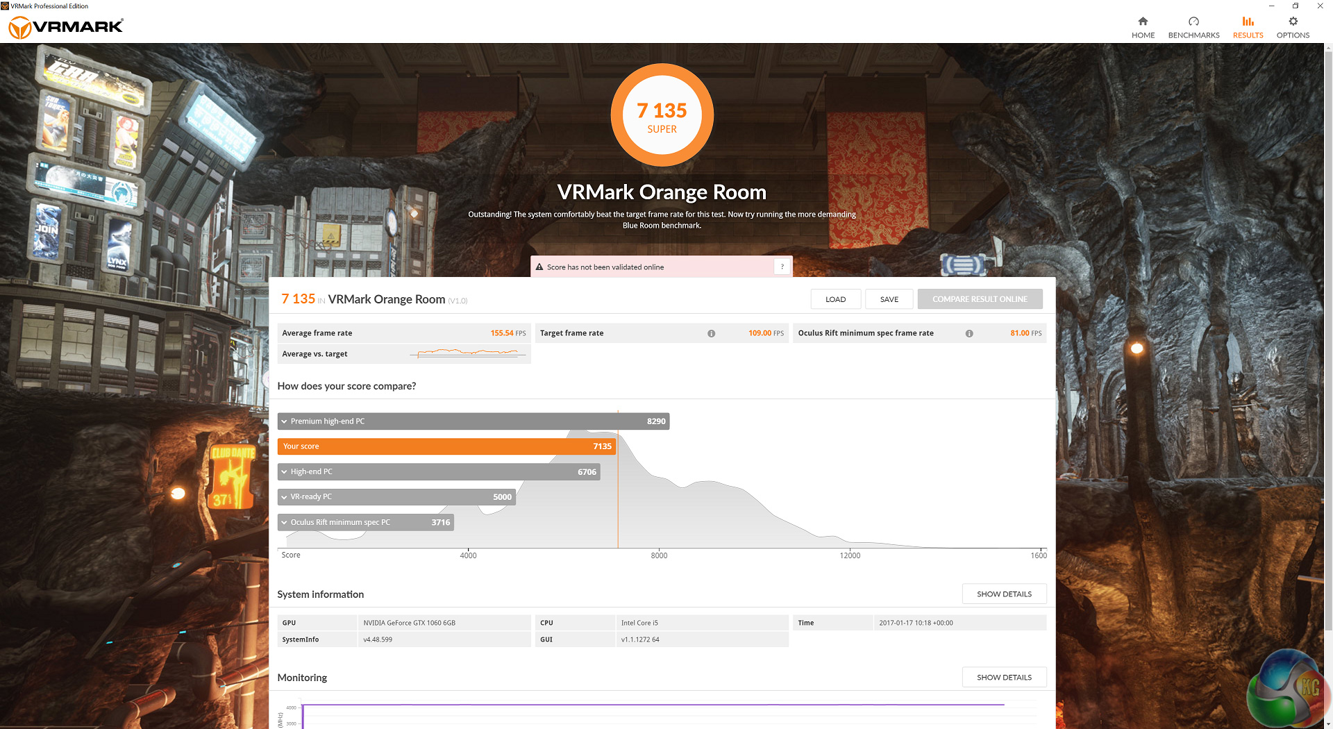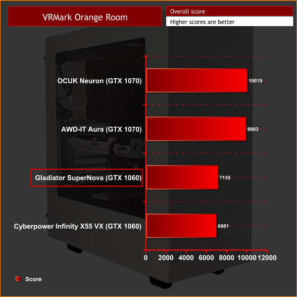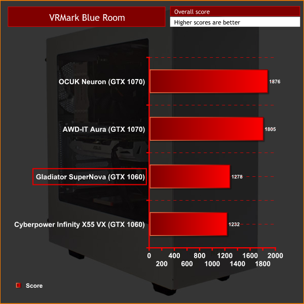 The SuperNova passes the Orange Room test with flying colours, so it is clearly VR capable. However, I am yet to see a system capable of passing the Blue Room – I think that test is unrealistically demanding. Either way, the results are still comparable and the SuperNova beats the Cyberpower system by 46 points.
