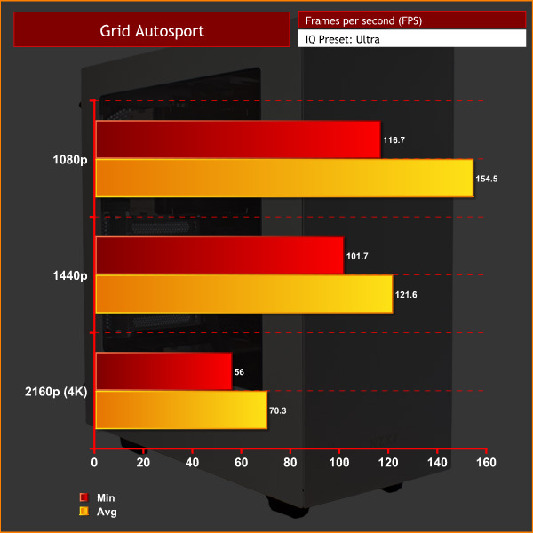 Even though it is now a relatively old game, I still benchmark Grid Autosport as it gives a good indication of a how a system performs with games that utilise less demanding game engines. As you can see, even at 4K, the frame rates are very good.