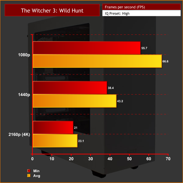We test using the ‘high’ preset. Given The Witcher 3 does not have its own in-built benchmark, I tested near the beginning of the game with Geralt riding through White Orchard on his horse, before dismounting and carrying on on-foot. I benchmarked 3 closely-matched runs and then took the average figures from those runs to present here.