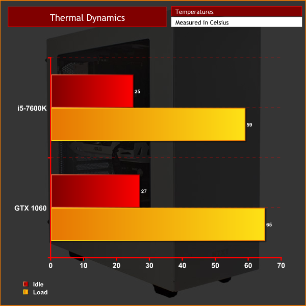 To measure idle temperatures, a reading was taken after having Windows open on the desktop for 30 minutes. A reading under load was taken with Prime 95’s SmallFFt test running alongside 3DMark Fire Strike.