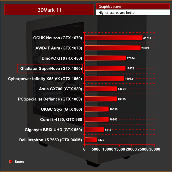 In 3DMark 11, the ASUS Dual GTX 1060 is faster than the MSI ITX 1060 used in the Cyberpower Infinity X55 VX system thanks to its enhanced cooling solution, as this allows GPU Boost 3.0 to dynamically raise the clock speed – even if both cards have the same advertised boost clocks.