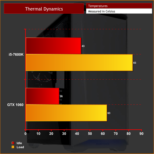I must admit, I do feel the i5-7600K gets a bit hot. Idling at 43 degrees is certainly on the warmer side, while a peak of 83 degrees is not ideal either. I put this down to the 4.7GHz overclock on the CPU which uses a heavy VCore of 1.38V.