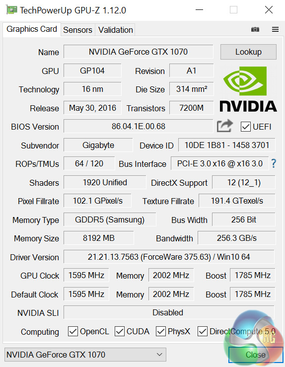 The Gigabyte GTX 1070 has a base clock of 1595MHz, while it boosts to at least 1785MHz under load. However, thanks to GPU Boost Technology 3.0, I saw it settle at 1949MHz when playing games. Out-of-the-box that is an impressive gain over the Founders Edition.