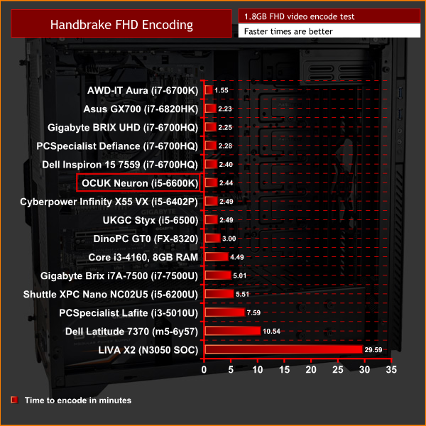 The last of our CPU-specific tests, Handbrake shows its love for extra threads here – the i5-6600K result is slower than the i7-6700HQ, despite the latter being a mobile CPU, because it ‘only' has four cores and four threads.