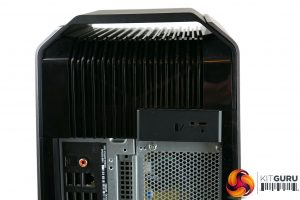 As for the overall cooling setup, this does depend on the configuration, with some using all air and some using liquid coolers. Here we’ve got a custom Alienware liquid cooler for the CPU that draws heat up to a 120mm radiator and fan at the top of the case.