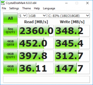 The Toshiba SSD in this PC (C:) is mighty fast when it comes to read speeds but our CrystalDiskMark test showed it struggles significantly when it comes to write speed. We tested this multiple times to verify it really is this slow and it consistently came out with the same result. We suspect this is at least in part because of the relatively small size of the drive, and that the 500GB version would be much faster.