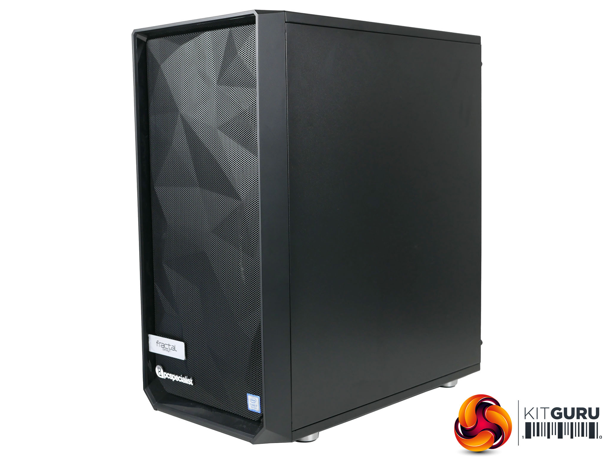 PC Specialist has opted for the Fractal Design Meshify C and its signature is an angular mesh on the front that allows for three big fans to pull in air. It’s functional but isn’t the most attractive, particularly once a PC has bright lights in it, as it does here. The lighting shines through the grill on the front, making a show of the lattice support structure, fans and brackets behind.