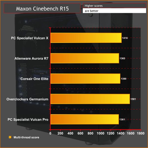The PC Specialist Vulcan X’s overclocked 8700K manages to pull out a small lead over all the other systems we’ve compared it to, other than the Overclockers UK Germanium. Its 4.9GHz overclock resulted in a surprisingly large lead over all the rest.