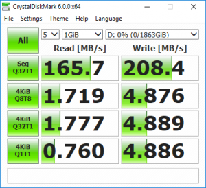 CrystalDiskMark 5.1.1 is an industry standard benchmark for testing the raw speed of a storage device. It uses a test file to variously write data to or read data from the drive, checking for sequential read and write speed and random read and write performance, with it also testing performance at various queue depths. The size of the test file can be selected from 50MB to 32GB. We test using the default 1GB file size.