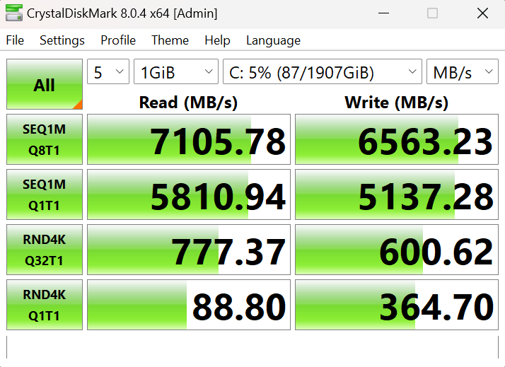 Storage speed won’t be an issue when gaming with the Infinity X135 Plus, as you can see the 2TB Solidigm P44 Pro provides read speeds of over 7000MB/s and write speeds of around 6500MB/s which is what we would expect from this drive.