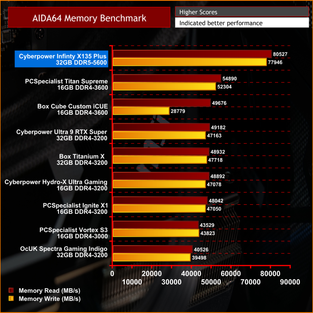 Using CrystalDiskMark, we measure the performance of all storage devices installed in the Cyberpower Infinity X135 Plus. AIDA64’s memory benchmark is run to determine system memory performance and we also compare PCMark10 performance against other systems that we have reviewed previously.