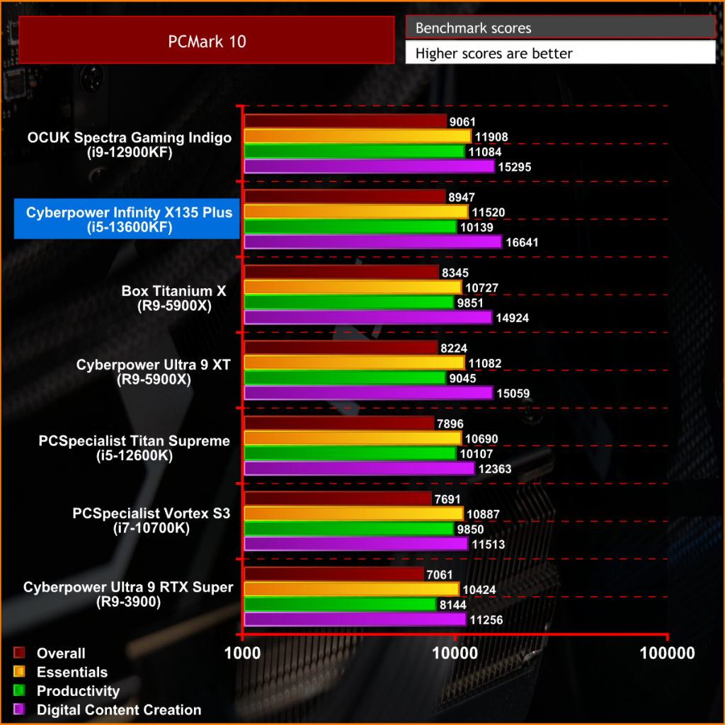 First, let’s look at the system’s multitasking and productivity performance. In the PCMark 10 benchmark, the Infinity X135 Plus is only just behind the OCUK Spectra Gaming Indigo system which used an Intel Core i9 CPU from the previous generation and even beats that system in digital content creation performance.