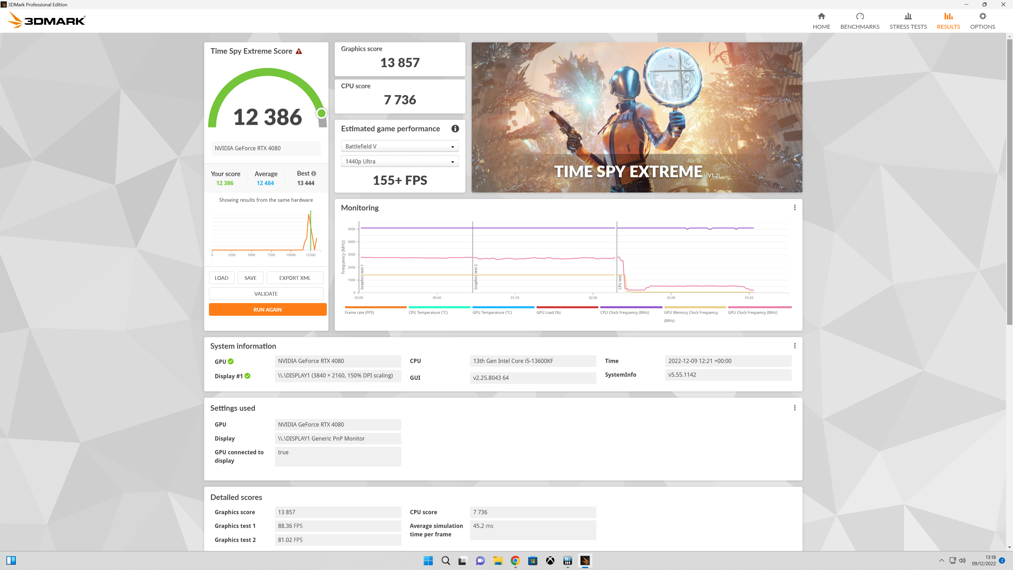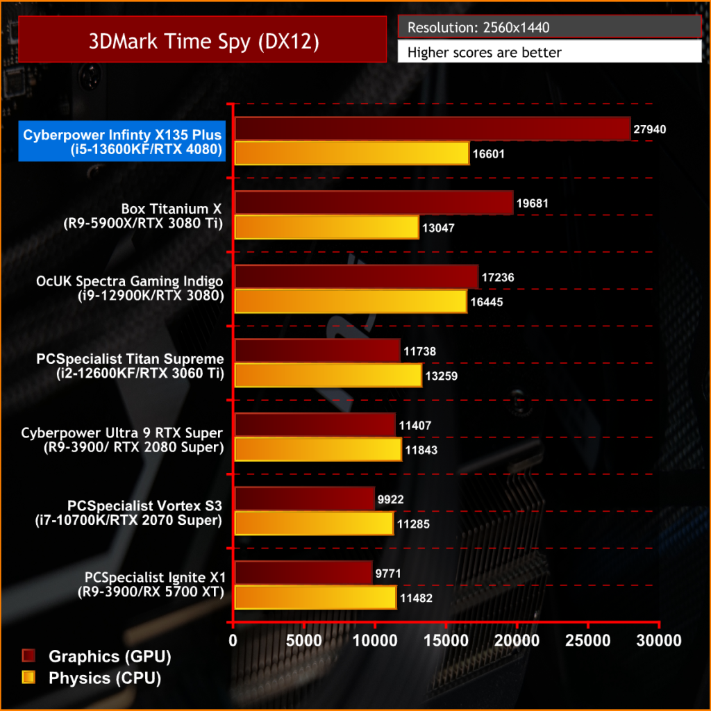 In the 3DMark Time Spy benchmark the CPU score is very impressive, beating off competition from AMD’s previous 12 core 5900X and a match for the previous generation Intel Core i9 flagship. GPU performance is outstanding thanks to the Nvidia RTX 4080 powerhouse.