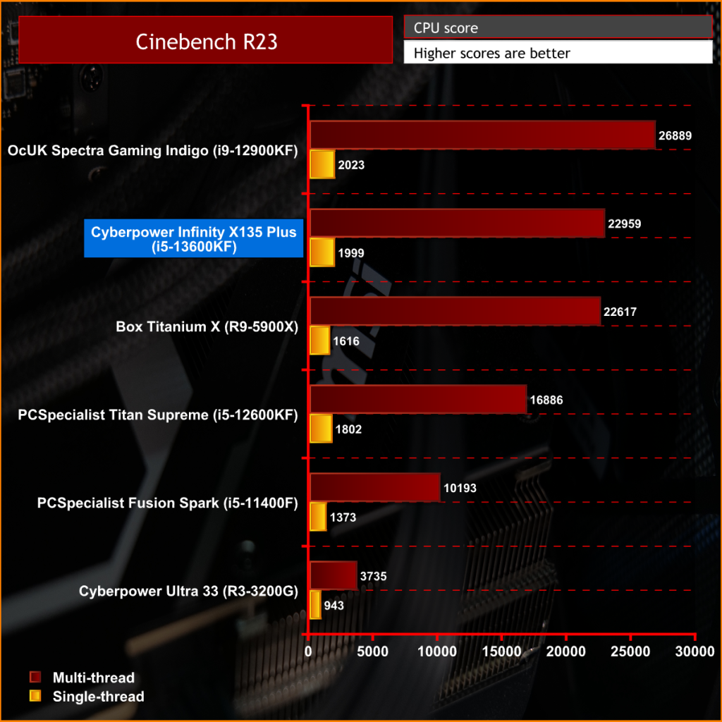 Cyberpower has equipped the Infinity X135 Plus with a new Intel Core i5-13600KF processor. Not only is it a great CPU for gaming but also very capable of multitasking, which makes it an ideal CPU for general windows tasks and demanding productivity work. With this in mind, we ran Cinebench R23 multi and single-core tests and compiled a chart below to compare the results against other pre-built systems that we have reviewed.