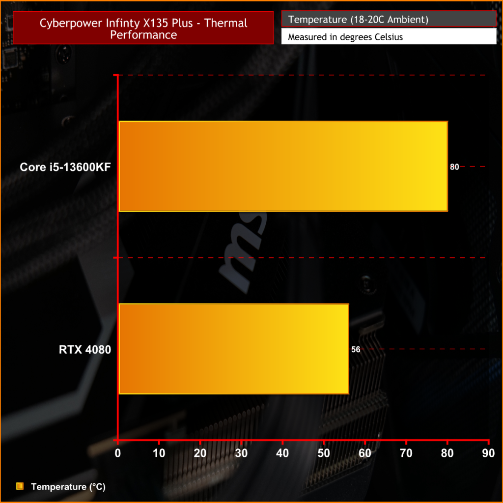 An important characteristic of any gaming PC is how it handles the cooling of the internal components. To see how the Cyberpower Infinity X135 Plus stacks up we ran a high load on the system with the case in its default configuration to simulate long gaming sessions and measured the steady state temperature of the CPU and GPU.