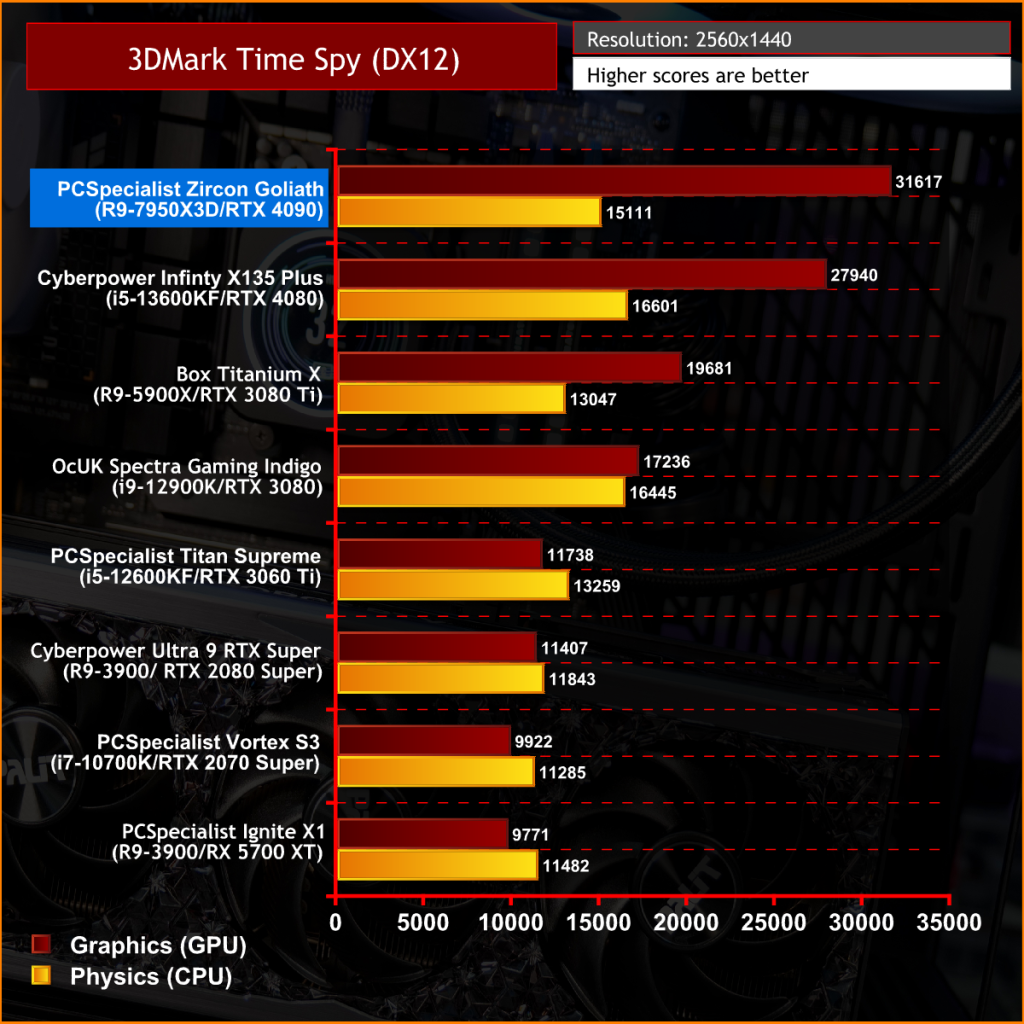 The Time Spy benchmark result for the Zircon Goliath produced a high score but was a little down on what we saw from Dominic’s review of the 4090 Founders edition which is disappointing. The reason for this could be due to heat and GPU core frequency being affected. We will see what’s going on in the thermal tests soon.