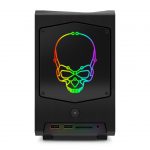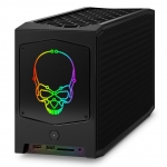 On the outside, the NUC 11 Extreme kit hasn't changed since we first reported on it, featuring vents on the sides and the top, a customisable RGB-backlit skull logo on the front panel, and RGB stripes below the chassis. On the inside, there are 3x 92mm fans, a 650W 80-Plus PSU, and a NUC 11 Extreme compute element.