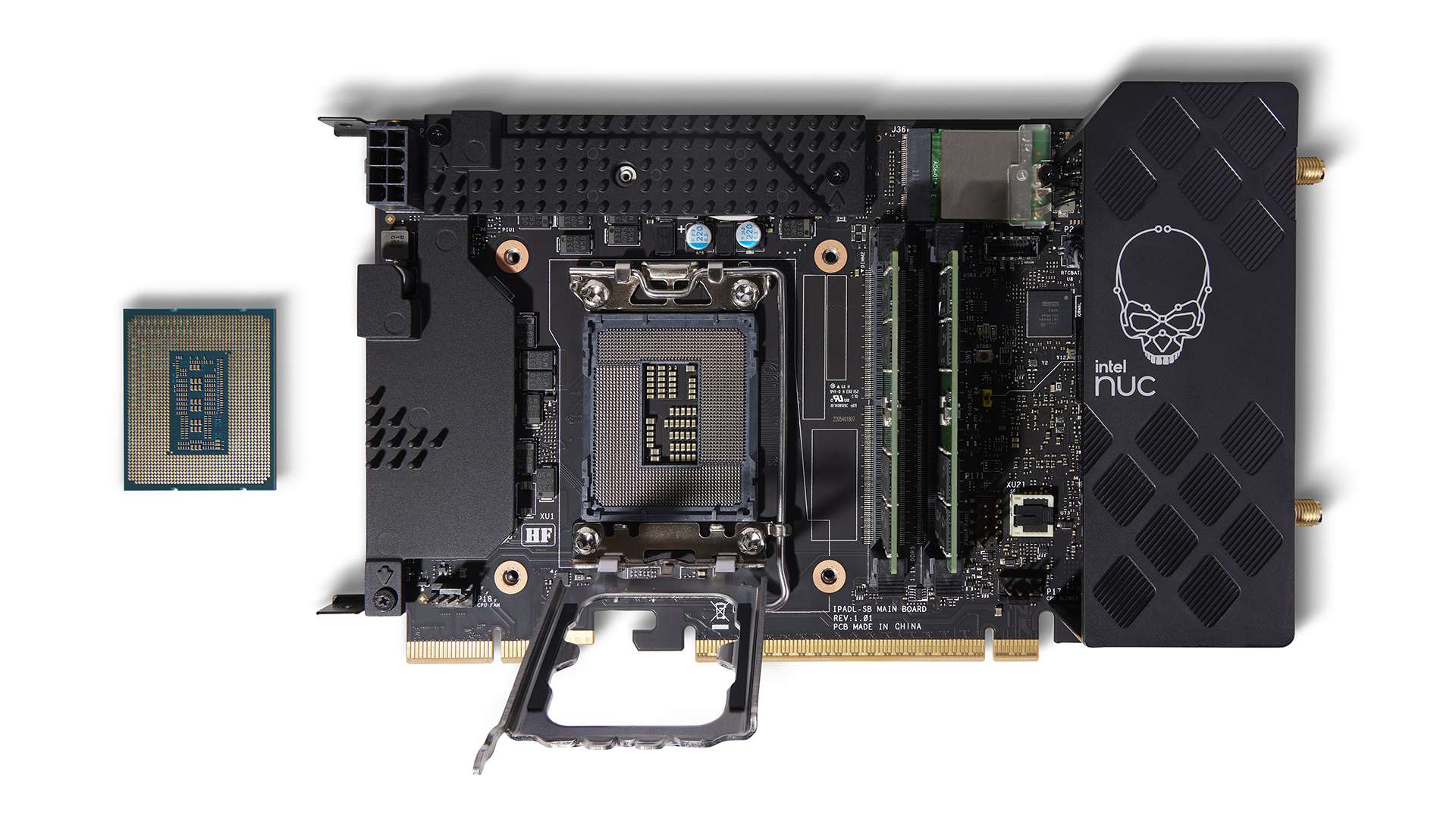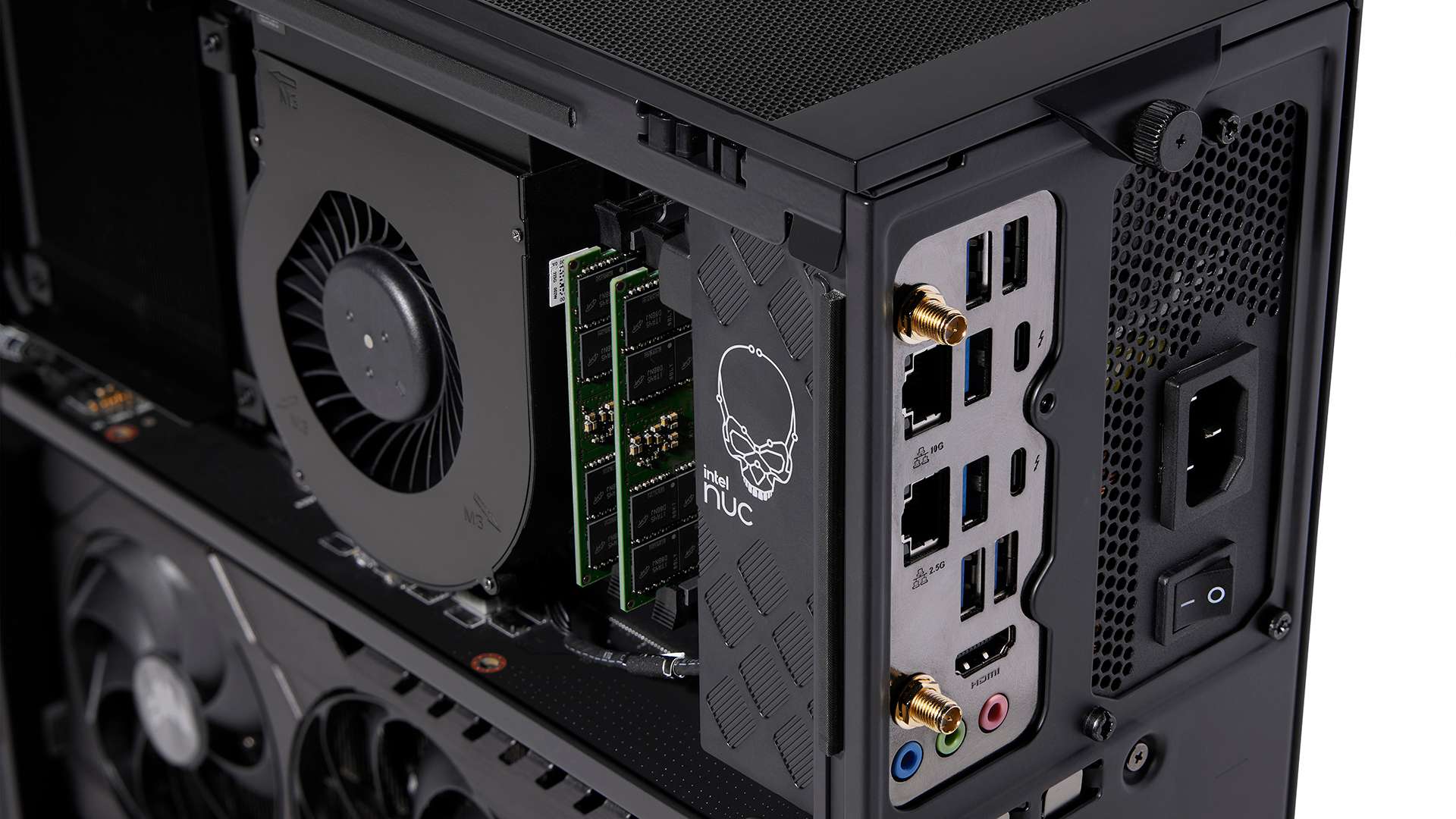 Powered by up to a Core i9-13900K (other options include the Core i7-13700K and the Core i5-13600K), the Compute Element found inside the NUC 13 Extreme supports up to 64GB dual-channel DDR5-5600 SODIMMs, PCIe 5.0 GPUs, and has space for three PCIe 4.0 NVMe SSDs.
