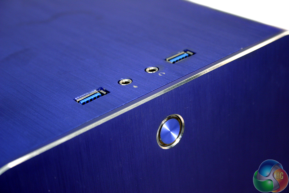 At the front end there are a pair of USB 3.0 ports, as well as a headphone and mic port. The power button, located at the top of the front panel is also finished in aluminium. It glows red when powered on.