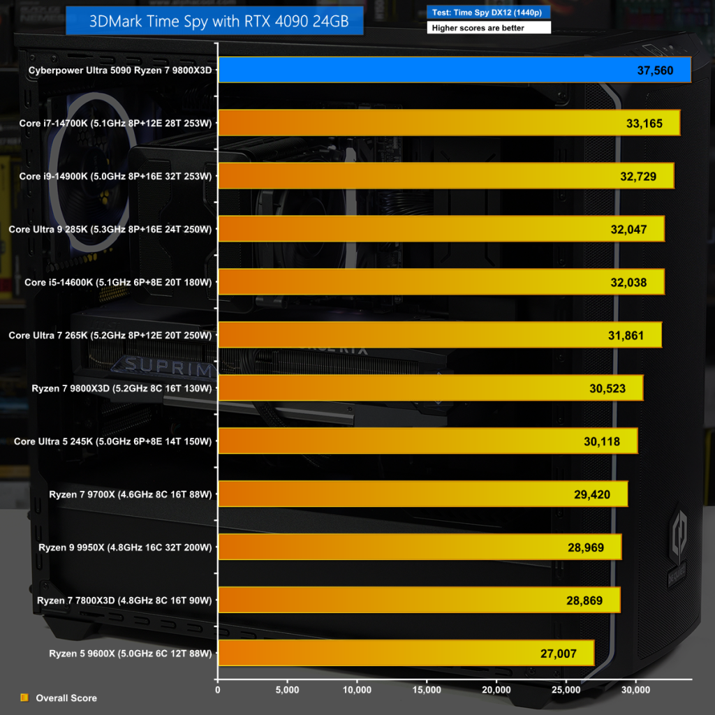 Moving on to gaming tests we start with the synthetic 3D Mark Time Spy which shows a great result for the CyberPower. This is an unfair competition as our test PC is using the MSI RTX 5090 where the other systems had an RTX 4090 and the results speak for themselves.