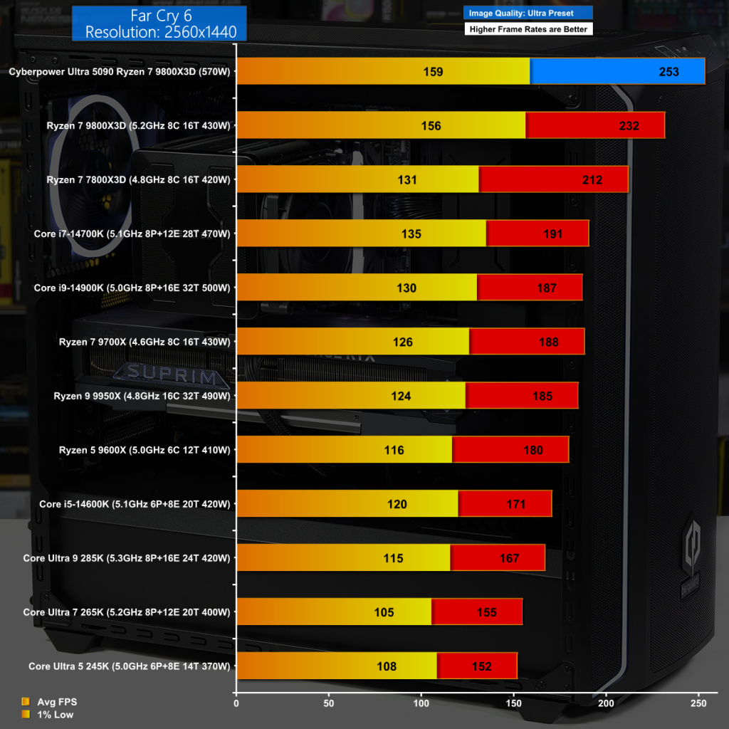 Far Cry 6 at 1440p delivers a fine result for the CyberPower, thanks to the combination of Ryzen 7 9800X3D CPU and RTX 5090 graphics.