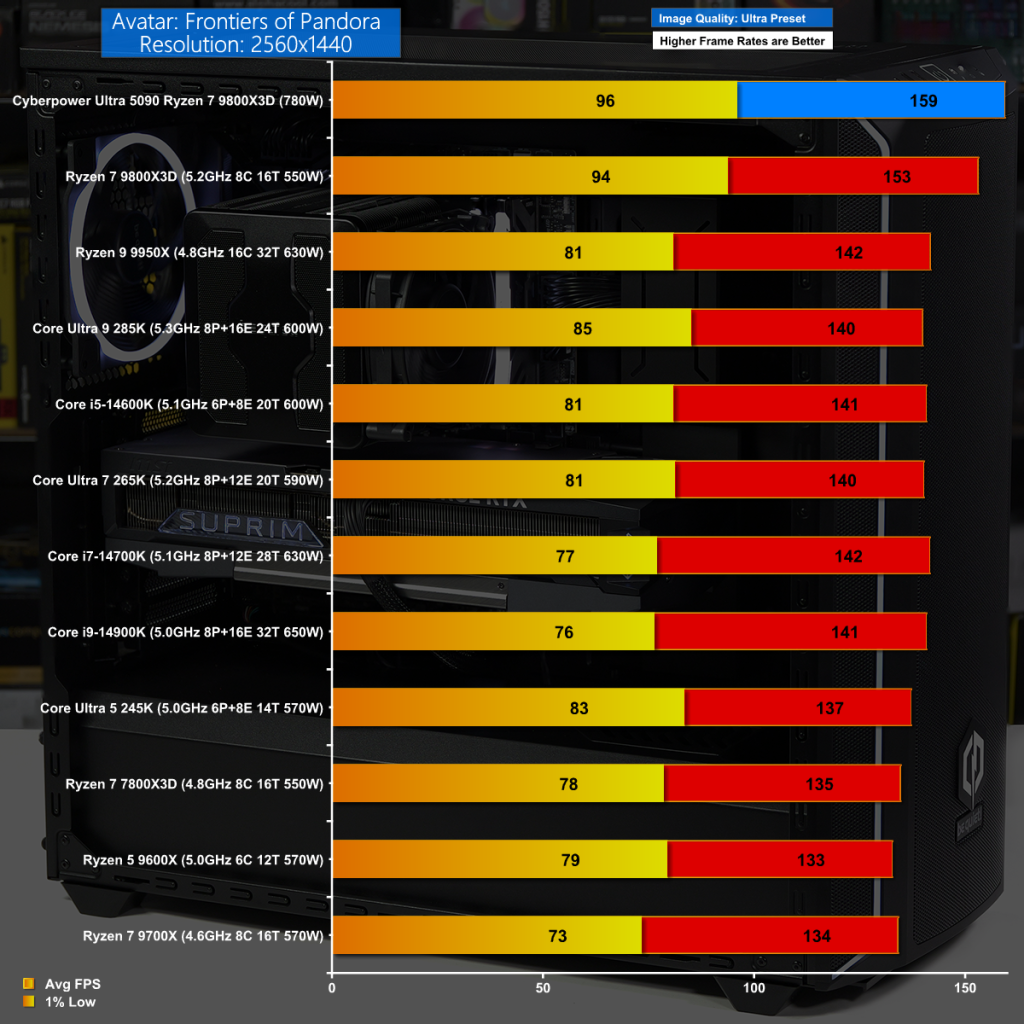 Avatar: Frontiers of Pandora shows a smaller margin of victory for the RTX 5090 PC however a win is a win and the performance is stellar.