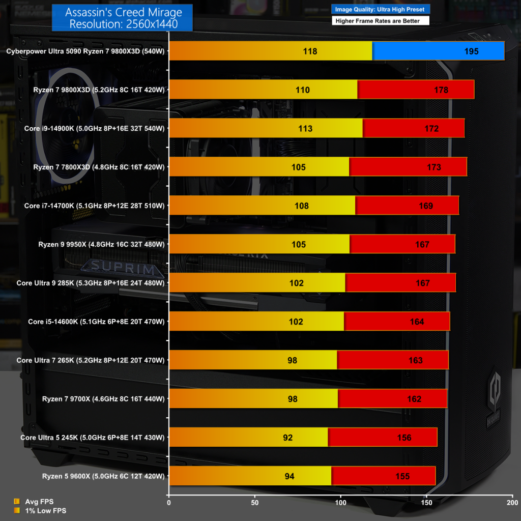 Assassin's Creed Mirage runs at breakneck speed at 1440p on this CyberPower system and the MSI RTX 5090 does a fine job.