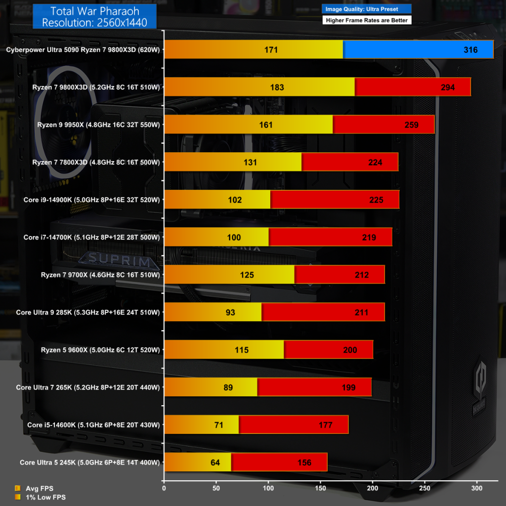 We finish with Total War Pharaoh which gives a huge frame rate beyond 300fps at 1440p. Wow.