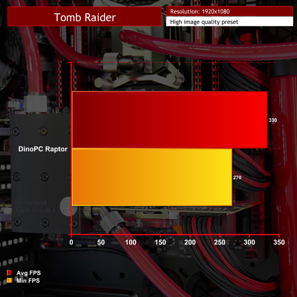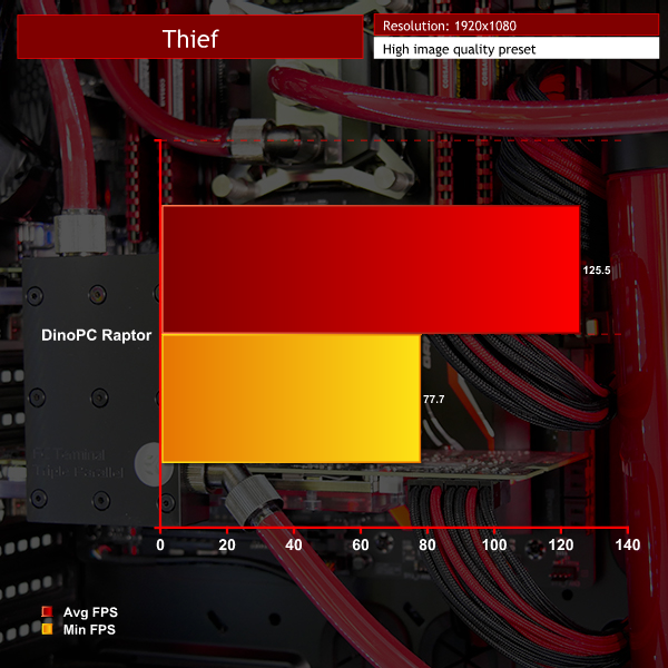 You can clearly see the results in 1080p gaming where the frame rates steam along at 125fps in Thief and 330fps in Tomb Raider, both on High Quality presets, however it is clear this system is designed for gaming at 4K. As you can see in the video, Raptor handles 4K with ease and ran through Thief at 59fps.