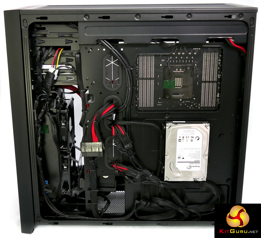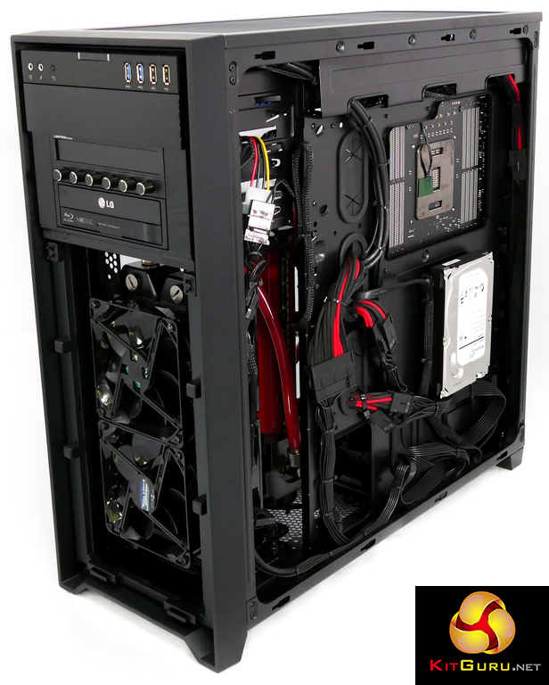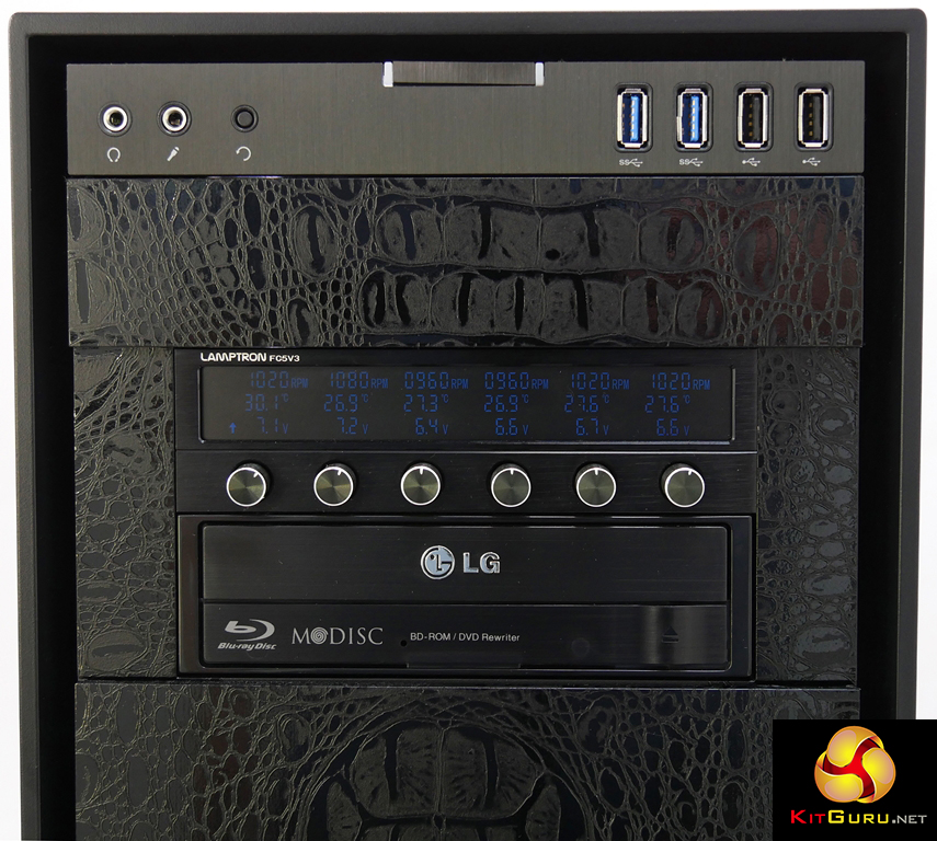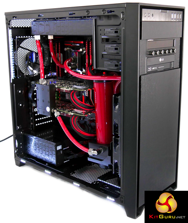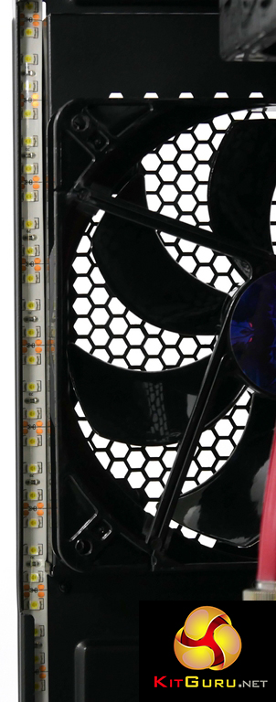 In total there are nine Phobya G-Silent fans, each rated at 1,600rpm but slowed below 1,000rpm by the Lamptron FCF v3 fan controller that is located in an optical drive bay. Eight 120mm fans are arranged with four on the 240mm radiator in push/pull, three on the top radiator, one in the floor of the case below the front radiator and a single, larger, 140mm fan at the rear of the case.