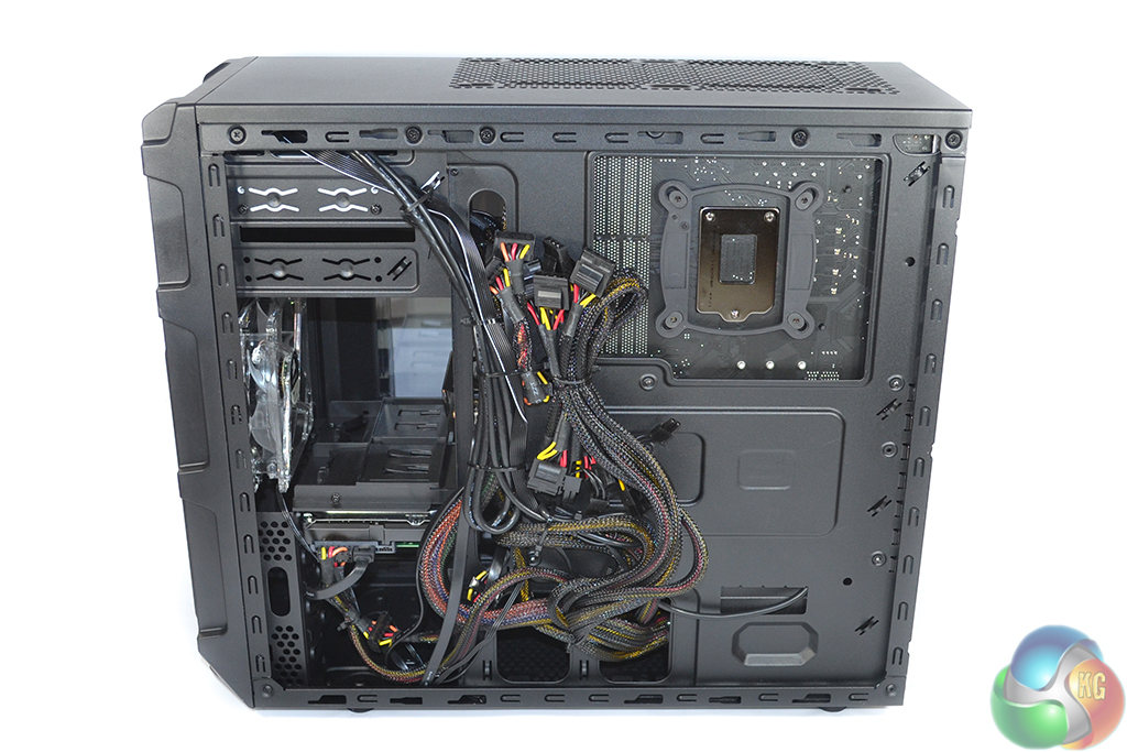 Clear access to the drive bays and motherboard cut-out is maintained, but connecting power cables to additional components will require significant cable management efforts.