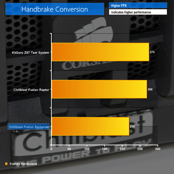We measured the average frame rate achieved for a task of converting a 4.36GB 720P H.264 movie (in the MKV container) to one in the MP4 container.