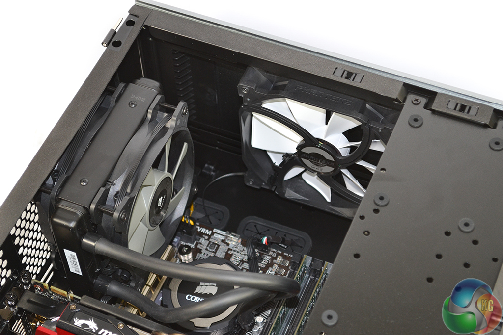 A Phanteks 140mm roof fan is set as intake, allowing it to accompany the 200mm front intake fan in drawing air into the system.