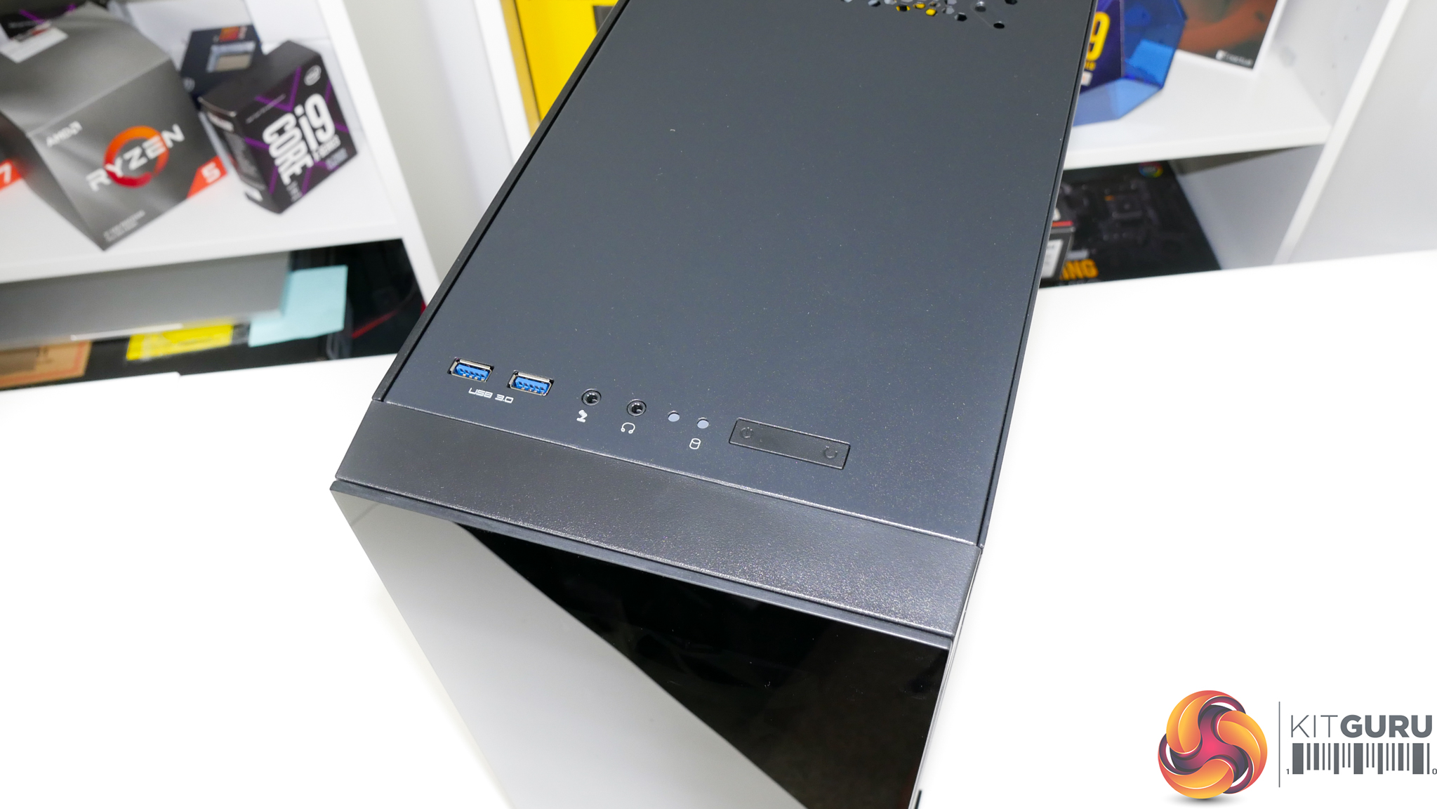 Front IO ports consist of two USB 3.0, 3.5mm headphone and microphone jacks, power and reset buttons, and the relevant LED indications.