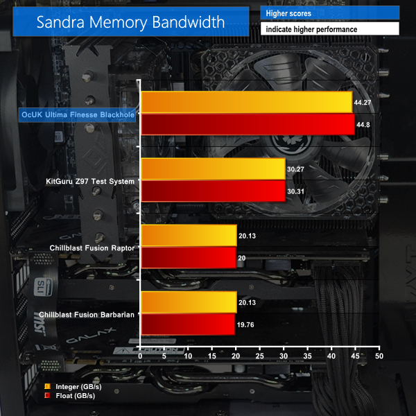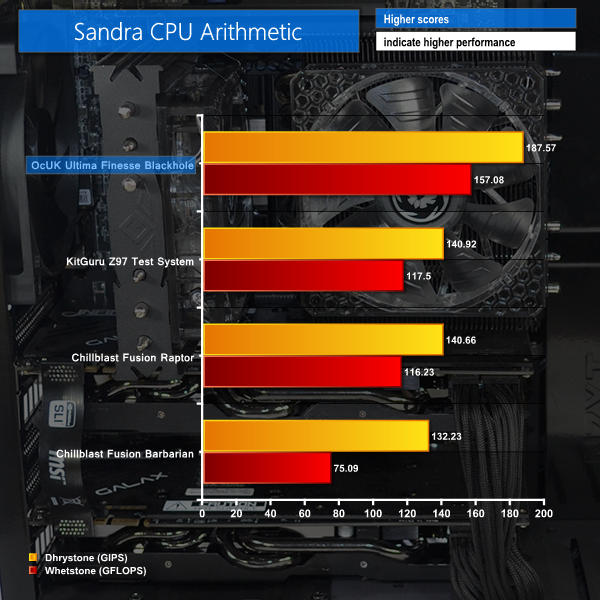 3DMark heavily rewards the Ultima Finesse Blackhole for its pair of GTX 970 graphics cards – the Fire Strike score hit almost 17,000 points. Quad-channel, albeit relatively slow and with loose timings, memory gives the Blackhole a distinct advantage when it comes to pure memory bandwidth.