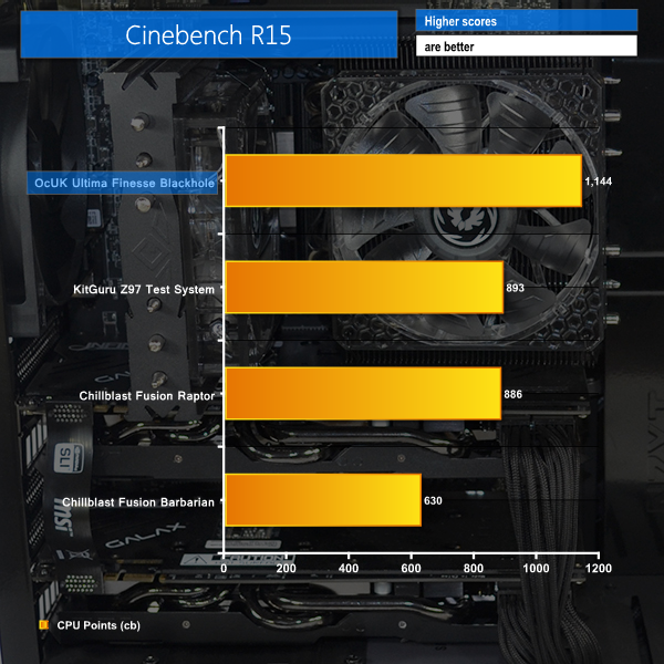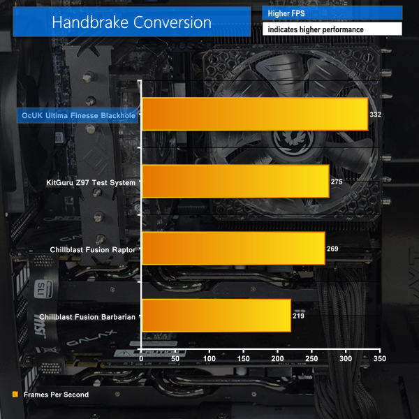 Cinebench registered a greater-than-250 point lead for the Ultima Finesse Blackhole, while Handbrake was rewarded with 20% better frame rates than the 4790K-based comparisons.