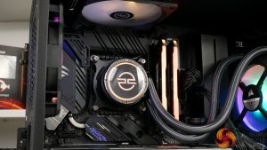 Cooling is handled by a 240mm PCSpecialist FrostFlow 240 series RGB AIO liquid cooler. The dual 120mm intake fans have been switched out to Corsair LL120 RGB models mounted to pull air through the radiator. A 240mm AIO is a perfectly logical partner for the Core i7-10700K, especially when running at its default power modes.