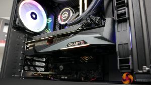 Clearly the star of the show is that Nvidia RTX 3080 graphics card. PCSpecialist opts for the triple-fan, two-and-a-half slot Gigabyte OC model of the 10 Gig Ampere brute. And it’s not just star of the show in terms of gaming might; the twelve-and-a-half-inch monster dominates the majority of the internal build area and pushes up closely to the front mounted AIO cooler.