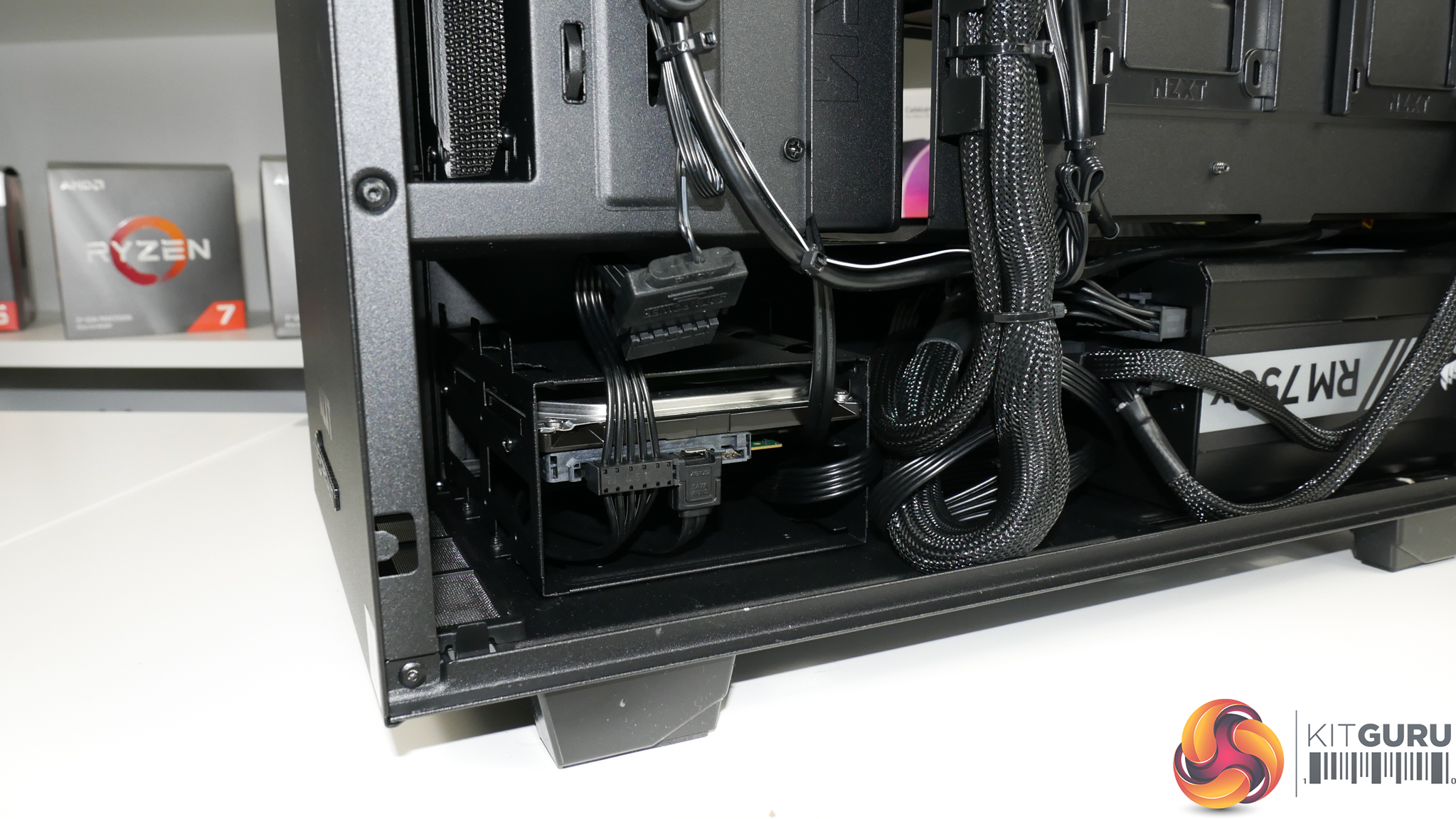 Cable management inside the NZXT chassis is clean, despite the use of the Corsair PSU’s default cables that are not braided or eye-catching. There are a couple of cables on the IO ports at the bottom of the motherboard that deviate from the black shrink-wrap styling, but these are relatively minor points.