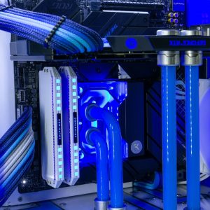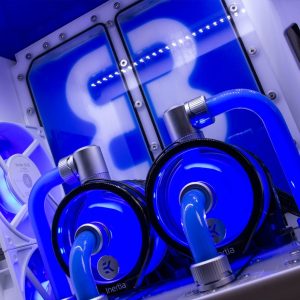 To keep all of this cool, the Comet MK2 packs a dual-loop cooling system with hardline tubing, a pair of 480mm radiators, and twin D5 pumps. EK-CryoFuel Solid Azure Blue coolant is used, and the radiators are paired up with eight Noctua NF-F12 120mm fans. There are also three EK-Vardar Evo 120mm fans inside the case too.