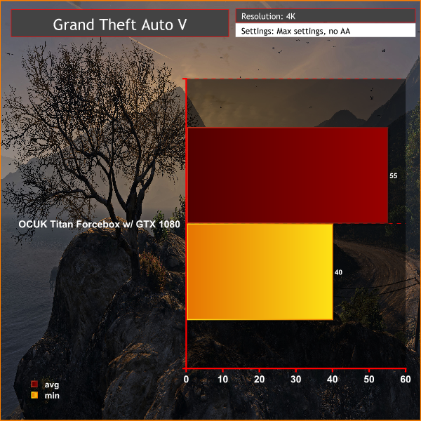 Jumping up to 4K, GTA V gets close to 60 frames per second but can't quite get there. Turning down a couple of settings should make it easily achievable.