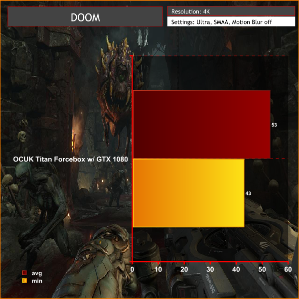 DOOM doesn't have its own built-in benchmark so for our tests today I will be benching the first Hell Spawner room in the game's campaign mode. This is the same place we used for the DOOM PC Game Analysis as it is easily repeatable and offers an accurate representation of what performance to expect throughout the game.
