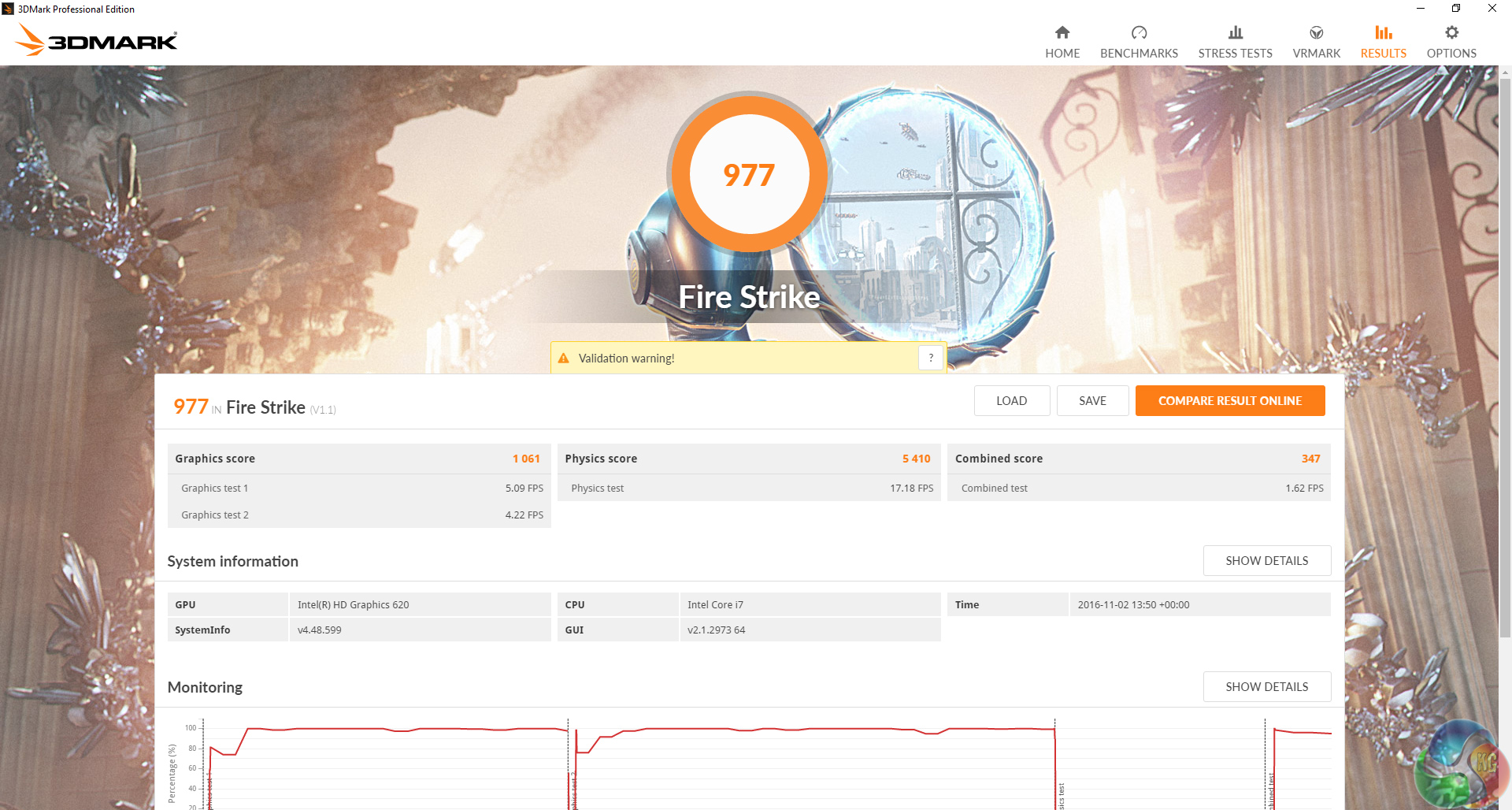 To first test the integrated Intel HD Graphics 620, I ran 3DMark Fire Strike.
