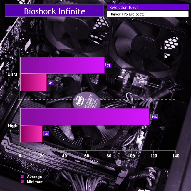 For this we used the built in Bioshock Infinite benchmarking utility, set at “High” and “UltraDX11_DDOF” settings, both at 1080p resolution.