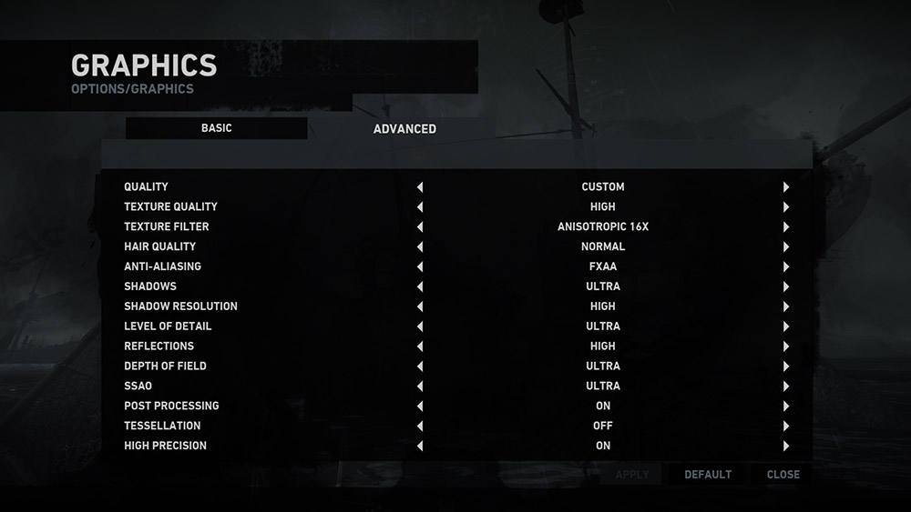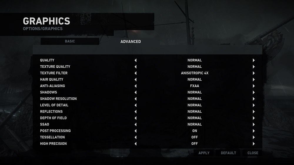 Default: All settings at medium, reflections disabled, anti-aliasing disabled.