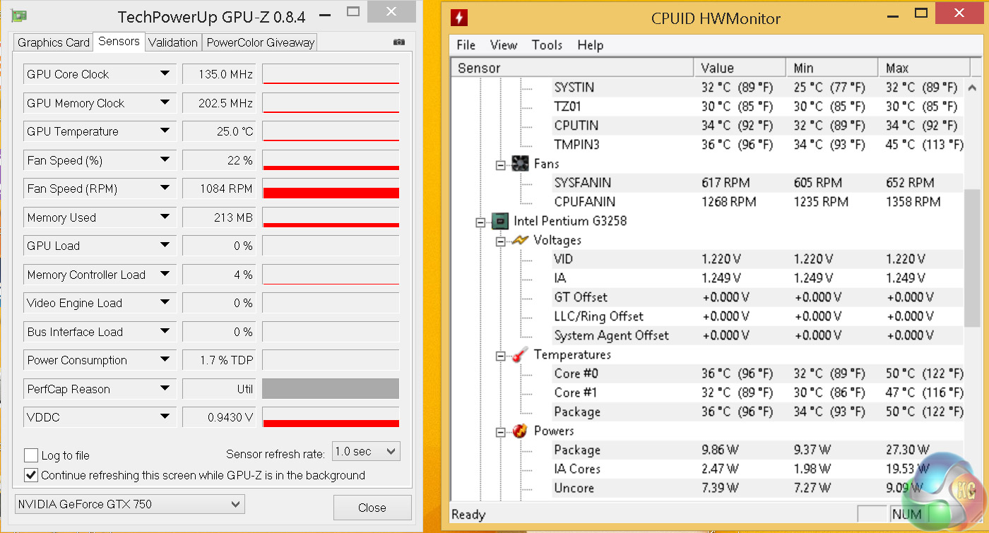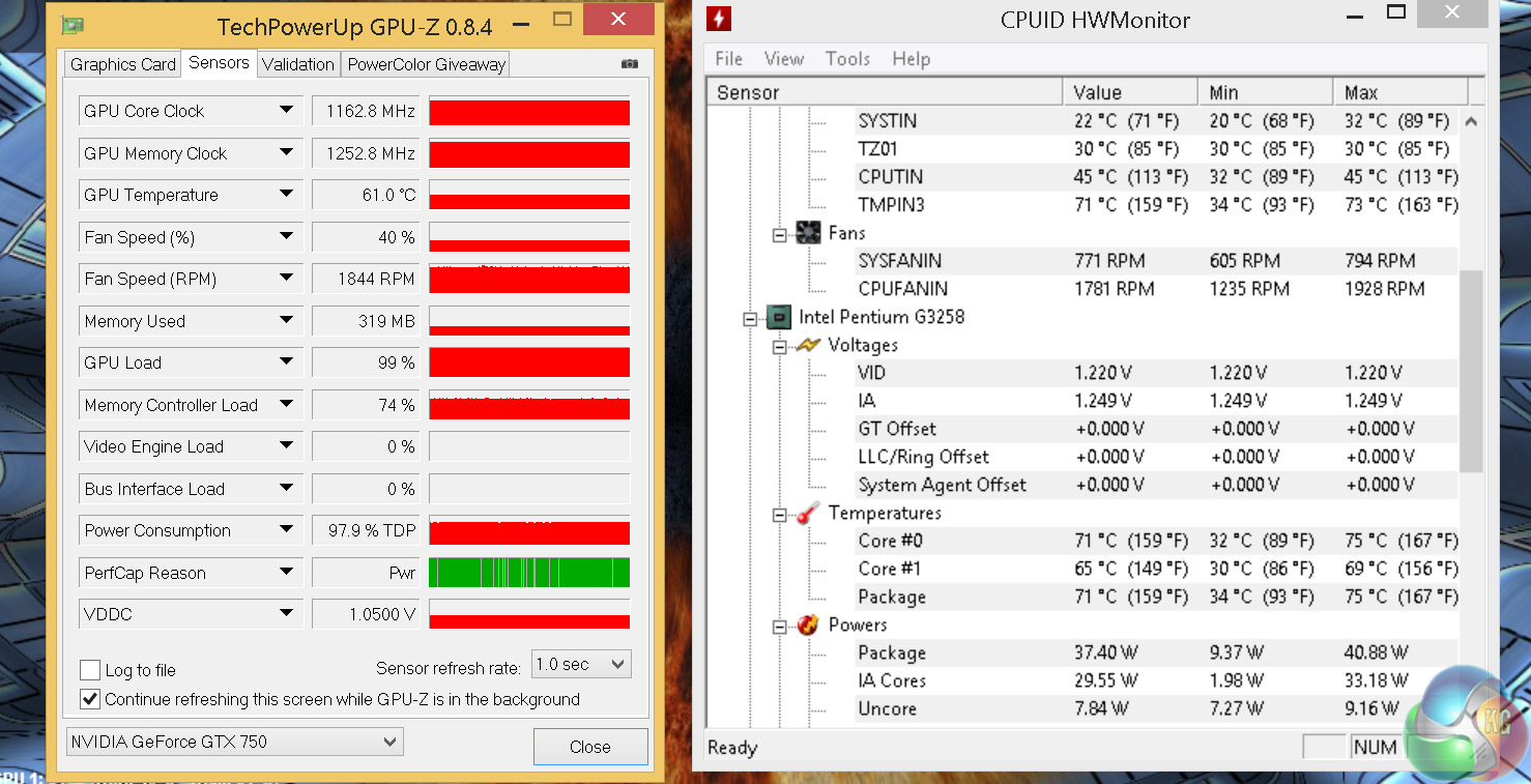 Although the GTX 750 has no trouble staying well within safe margins (so much so in-fact that the fan barely spins up even when it's been at near 100 per cent for over half an hour) the CPU is edging towards mid 70's – pretty much what we would expect with a reference Intel cooler fitted. Because of this I would not want to attempt any more aggressive overclocking unless this system was re-equipped with a more robust cooling solution.